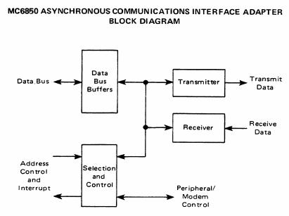 The MC6850 is an asynchronous communications interface adapter. It provides the data formatting and control to interface serial asynchronous data communications information to bus organized systems such as the MC6800 microprocessing unit. The bus interafce of the MC6850 includes select, enable, read/write, interrupt and bus interface logic to allow data transfer over an 8-bit bidirectional data bus.